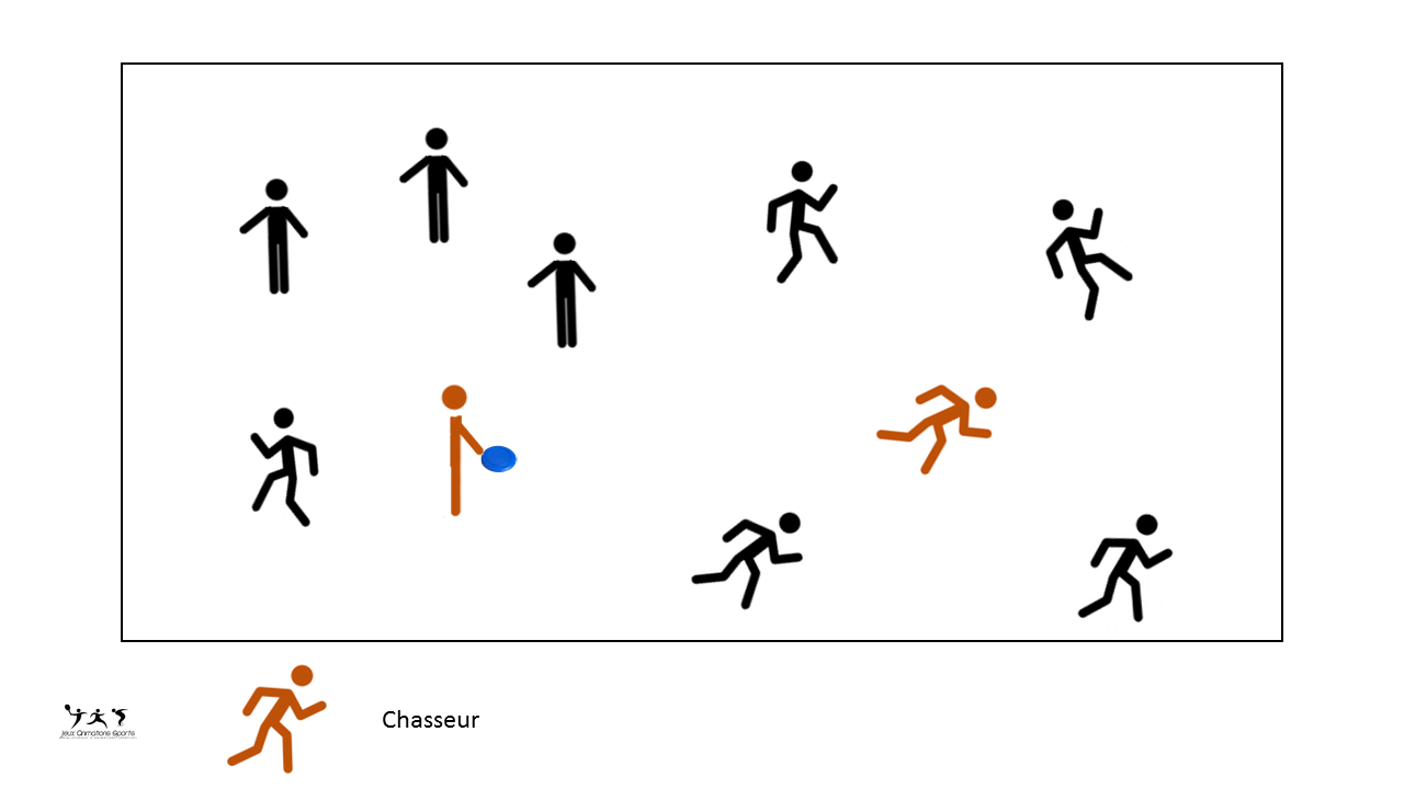 Un attaquant est prêt à lancer le frisbee. Les autres attaquants sont dans la zone d’attente à la file indienne. Un défenseur est le capitaine. Il se place dans le cerceau. Les autres défenseurs sont répartis dans l’aire de jeu.